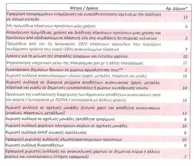 Η απαγόρευση πλαστικών προϊόντων μιας χρήσης εφαρμόζεται από 11 δήμους, ενώ έπρεπε να ισχύει από τον Φεβρουάριο του 2021. Η χωριστή συλλογή βιοαποβλήτων λειτουργεί σε 9 δήμους, ενώ τα κλωστοϋφαντουργικά προϊόντα συλλέγονται χωριστά από 10 δήμους.
