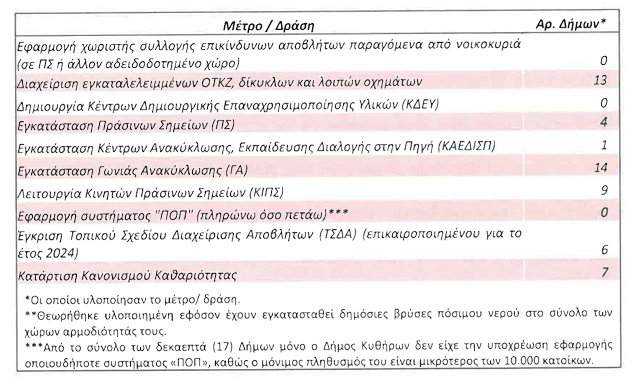 Επίσης, κανένας δήμος με πληθυσμό άνω των 20.000 κατοίκων δεν έχει δημιουργήσει Κέντρο Δημιουργικής Επαναχρησιμοποίησης Υλικών, παρότι όφειλε να το κάνει από αρχές του έτους. Ταυτόχρονα, 13 δήμοι δεν έχουν εγκαταστήσει Πράσινο Σημείο και μόλις ένας δήμος λειτουργεί ΚΑΕΔΙΣΠ.