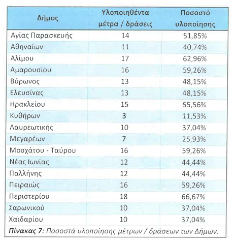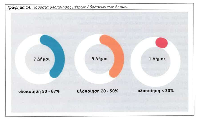 Μόλις επτά δήμοι υλοποίησαν πάνω από το 50% των μέτρων, με το μεγαλύτερο ποσοστό να φτάνει το 67%. Ένας δήμος εφάρμοσε λιγότερα από το 20% των προβλεπόμενων δράσεων.