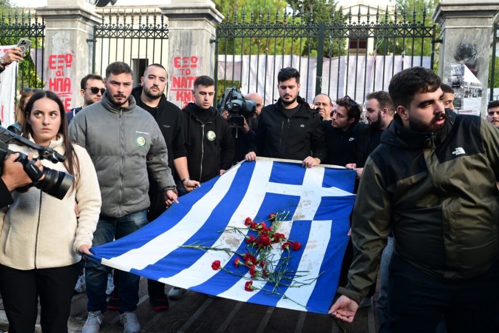Περίπου 15 κλούβες των ΜΑΤ ήταν στοιχισμένες επί της Βασιλίσσης Σοφίας για τη φύλαξη της πρεσβείας. Πίσω από τις ομάδες περιφρούρησης συντάχθηκε ο κορμός κάθε οργάνωσης με υψωμένα πανό, φωνάζοντας συνθήματα.