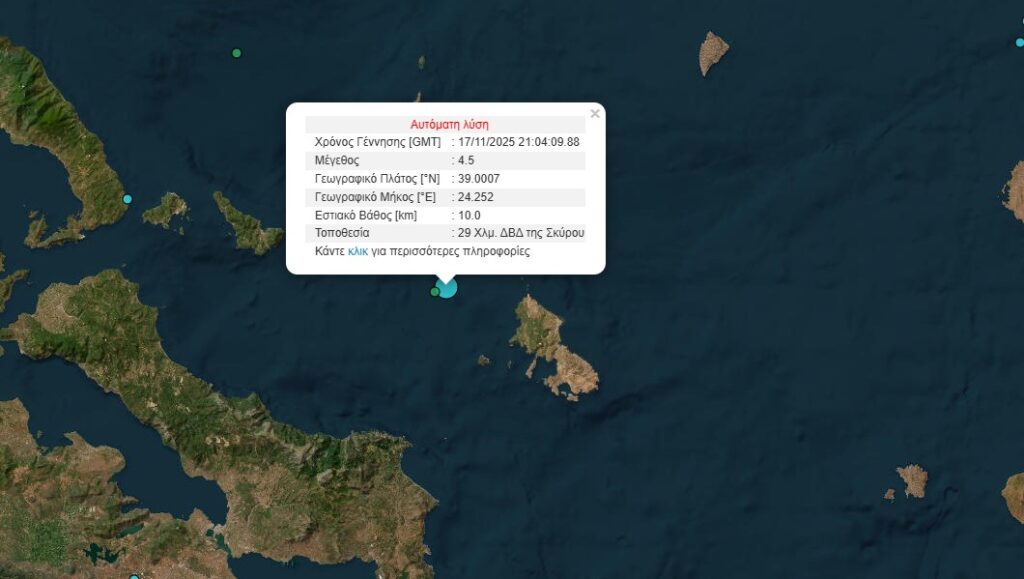 Σεισμική δόνηση 4,5 βαθμών της κλίμακας Ρίχτερ ταρακούνησε το βράδυ της Δευτέρας (17/11) τη θαλάσσια περιοχή της Σκύρου, προκαλώντας ανησυχία σε κατοίκους ευρύτερης περιοχής. Η δόνηση σημειώθηκε στις 11:04 το βράδυ και έγινε αισθητή σε μεγάλο μέρος της κεντρικής Ελλάδας, από τη Σκύρο μέχρι την Αττική.