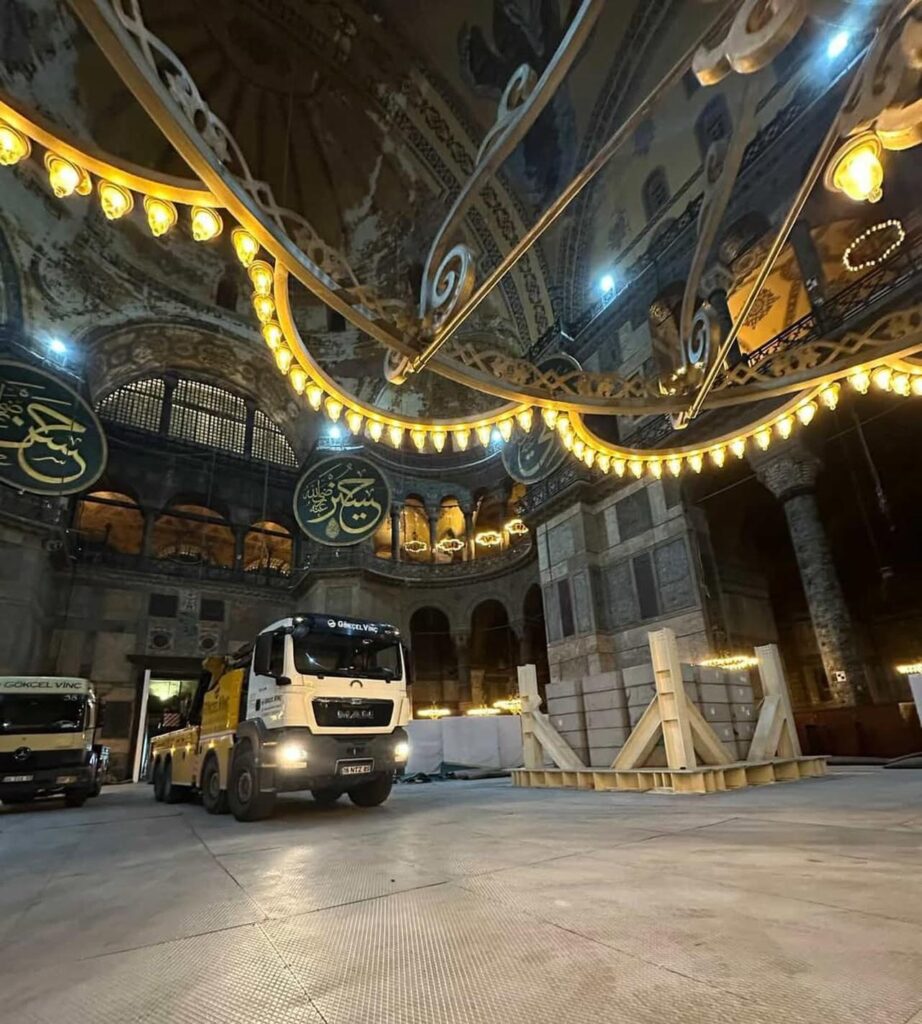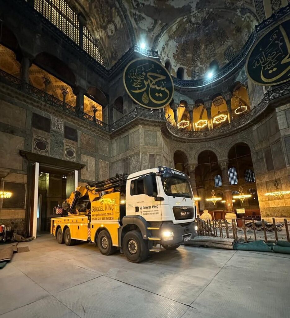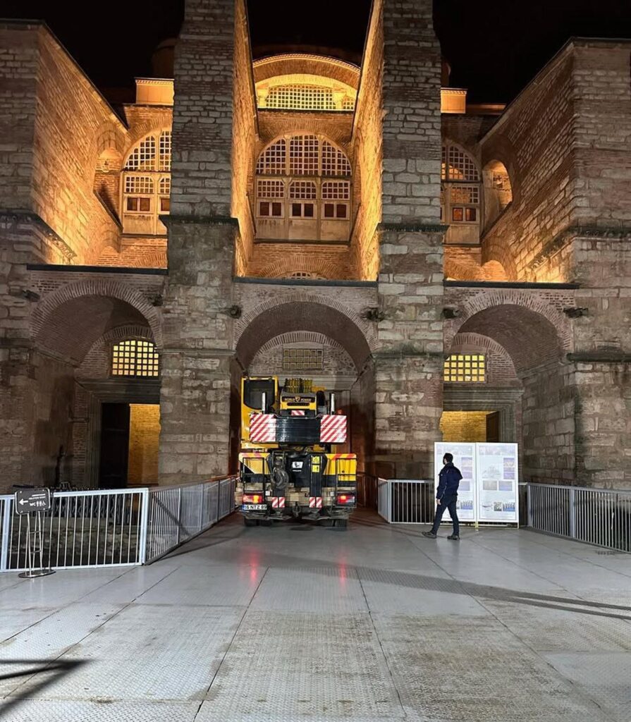 Εικόνες με βαριά οχήματα να κινούνται μέσα στην Αγιά Σοφιά έχουν προκαλέσει έντονες αντιδράσεις τις τελευταίες ημέρες. Τα φορτηγά και το γερανοφόρο όχημα βρίσκονται εκεί στο πλαίσιο εργασιών αναστήλωσης του ιστορικού μνημείου, όμως πολλοί εκφράζουν σοβαρές ανησυχίες για πιθανές καταστροφές.