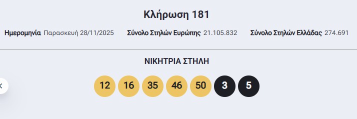 Ολοκληρώθηκε η 181η κλήρωση του Eurojackpot σήμερα Παρασκευή 28 Νοεμβρίου 2025, με έπαθλο που έφτανε τα 17 εκατομμύρια ευρώ. Η κληρωτίδα στο Ελσίνκι της Φινλανδίας ανέδειξε τους τυχερούς αριθμούς που θα μπορούσαν να αλλάξουν τη ζωή χιλιάδων παικτών σε όλη την Ευρώπη.