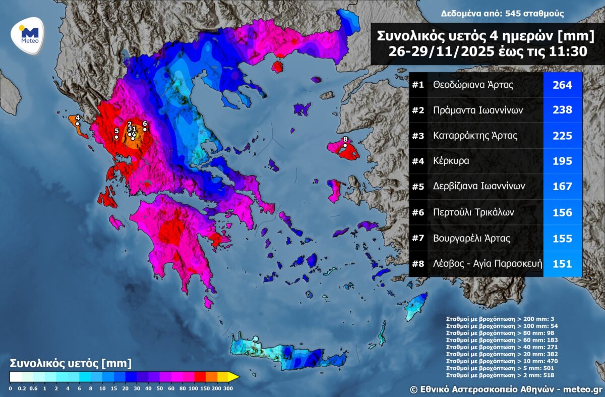 Το νησί δέχτηκε τεράστια ποσότητα βροχής σε λίγες ώρες. Από τα μεσάνυχτα έως τις 11:10 το πρωί του Σαββάτου έπεσαν 79 χιλιοστά βροχής, καταγράφει ο σταθμός του Εθνικού Αστεροσκοπείου. Τα φαινόμενα συνεχίστηκαν χωρίς διακοπή όλη νύχτα, με το βόρειο τμήμα του νησιού να δέχεται τα περισσότερα χτυπήματα.
