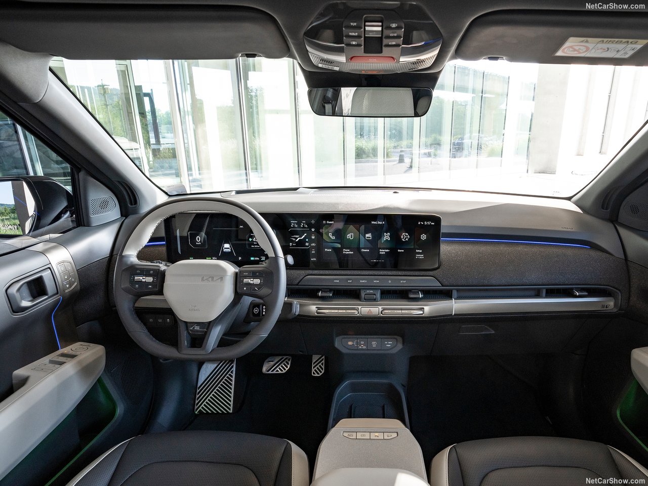 Στην καμπίνα κυριαρχούν τρεις οθόνες συνολικής διαγωνίου 30 ιντσών – δύο των 12,3 ιντσών για τα όργανα και το infotainment, plus μια μικρότερη 5,3 ιντσών για τον κλιματισμό. Η Kia χρησιμοποίησε 28,5 κιλά ανακυκλωμένων πλαστικών, δίνοντας μια γενικά καλή εικόνα ποιότητας.