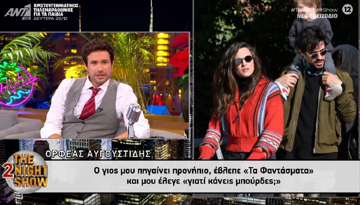 Η πιο αστεία στιγμή της συνέντευξης ήρθε όταν ο Αυγουστίδης αποκάλυψε την αντίδραση του μικρού γιου του στη σειρά. «Ο γιος μου πηγαίνει προνήπιο, έβλεπε Τα Φαντάσματα και μου έλεγε “Μπαμπά γιατί κάνεις μπούρδες”», είπε γελώντας. Όταν του απάντησε αν δεν ντρέπεται να λέει τέτοια για τον πατέρα του, το παιδί του απάντησε με απλότητα: «Όχι, δεν ντρέπομαι, εσύ δεν ντρέπεσαι;».